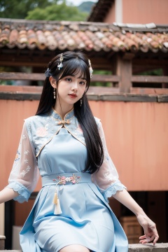 a young woman with long black hair,adorned with a hair ornament. She is wearing a traditional Chinese dress,which is predominantly white with blue accents. The dress has intricate lace detailing. She is seated on a structure,possibly a balcony or ledge,surrounded by greenery. The background is blurred,emphasizing the subject,and it appears to be an old town or village setting with traditional buildings.,