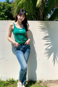 woman, Asian ethnicity, palm trees, casual fashion, denim jeans, sleeveless print top, sunny day, standing pose, hand in pocket, natural light, green foliage, outdoor setting, serene expression, long hair, sneakers, youth, tropical vibe, relaxed posture, clear sky, daytime, nature background, fashion accessory - headband
