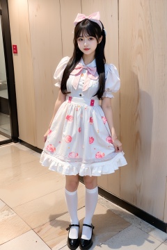 young woman, Asian, Lolita fashion, pastel dress, print dress, ruffles, white blouse, bow headband, long black hair, looking aside, puffed sleeves, knee socks, Mary Jane shoes, holding bag, indoor, light wood paneling, portrait, full body, cute style, soft colors, standing pose, casual elegance, fashion statement, youthful appearance