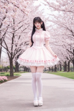 young woman,Asian ethnicity,cherry blossoms,sakura trees,spring season,pink flowers,white dress,Lolita fashion,knee-high socks,platform shoes,hair ribbon,standing,paved path,outdoor,daylight,dreamy atmosphere,soft focus,portrait photography,full-length pose,