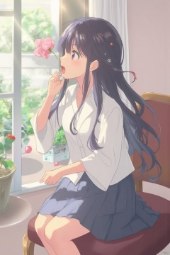 1girl, solo, long hair, looking at viewer, skirt, shirt, black hair, hair ornament, long sleeves, sitting, white shirt, flower, indoors, lips, plant, pink flower, red lips, potted plant
