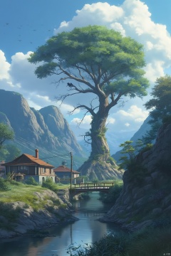 (((masterpiece))), ((extremely detailed CG unity 8k wallpaper)), best quality, high resolution illustration, Amazing, highres, intricate detail, (best illumination, best shadow, an extremely delicate and beautiful), 2D ConceptualDesign, scenery, outdoors, cloud, day, sky, tree, blue sky, mountain, landscape, water, Oil painting, The withered vines twined around the ancient tree, and at dusk the crows flew back to roost on the tree. Under the small bridge, the stream flows through the houses on both sides, A bleak visual sense