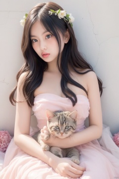 A young Asian woman wearing a flower wreath,a woman,dressed in a white strapless dress,there's a fluffy kitten next to it,Her right arm is draped in a light pink frock,adorned with a white ribbon. The woman's left arm is positioned in front of a white bed with a pink bedspread on it,adding a touch of color to the scene. The backdrop,a pink wall,is adorned with white windows,creating a stark contrast to the woman's white dress. A chandelier is adorned in the upper right corner of the frame,,,,