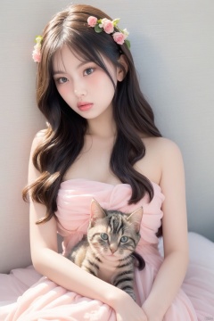 A young Asian woman wearing a flower wreath,a woman,dressed in a white strapless dress,there's a fluffy kitten next to it,Her right arm is draped in a light pink frock,adorned with a white ribbon. The woman's left arm is positioned in front of a white bed with a pink bedspread on it,adding a touch of color to the scene. The backdrop,a pink wall,is adorned with white windows,creating a stark contrast to the woman's white dress. A chandelier is adorned in the upper right corner of the frame, ((poakl))