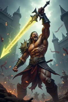 A dynamic fantasy-style combatant, mid-battle, with a fierce expression and a glowing, enchanted sword raised high. The scene is framed in a close-up, capturing the intensity of the moment. The lighting is dramatic, with a spotlight effect highlighting the warrior's muscular physique and intricate armor adorned with mystical runes. The composition is balanced, with the sword's energy field radiating outward, creating a sense of power and urgency. The background is a blurred, ethereal battlefield, with swirling mists and distant, towering castles. The overall atmosphere is one of epic, magical combat.