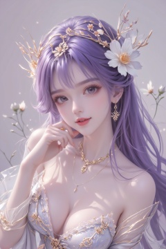 1girl, solo, long hair, looking at viewer, hair ornament, dress, jewelry, purple eyes, upper body, purple hair, flower, teeth, necklace, white dress