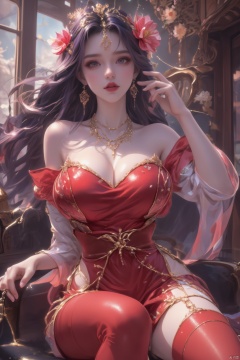 1girl, solo, long hair, breasts, looking at viewer, black hair, hair ornament, thighhighs, dress, jewelry, flower, earrings, indoors, hair flower, window, garter straps, red dress, red lips, red thighhighs,purple hair,qfl