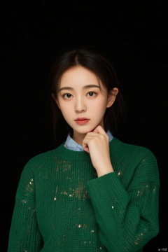 Surrealist art chinese girl,18yo,Portrait Studio,facial,official art,photographic lights,warm light,black background,realistic,solo,Sony A7R IV with Sony FE 85mm f-1.4 GM,Agfa Vista 400,green sweater,a blue blanket,surrealistic,16k image quality,sparse mesh sweater, . Dreamlike, mysterious, provocative, symbolic, intricate, detailed