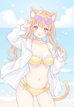(best quality), ((masterpiece))Thin lines, 1girl, solo, animal ears, brown hair, swimsuit, cat ears, hair ornament, breasts, bikini, eyewear on head, outdoors, heart, day, twintails, tail, open clothes, navel, heart-shaped eyewear, cat tail, long hair, yellow bikini, medium breasts, cloud, sky, looking at viewer, sunglasses, frills, cat girl, ocean, cleavage, white shirt, blue sky, shirt, collarbone, bangs, off shoulder, blush, horizon, hairclip, bare shoulders, yellow nails, hand up