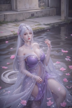 1girl, solo, long hair, breasts, hair ornament, dress, cleavage, bare shoulders, jewelry, upper body, flower, white hair, water, petals, facial mark, ring, purple dress, stairs, forehead mark, pillar