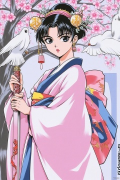 1990s retro anime illustration, a Japanese woman dressed in a traditional kimono, adorned with a black crown, is holding a sword in her right hand. She is flanked by two white birds, each flying in the same direction. The woman's dress is adorned in a variety of colors, including pink, blue, white, and red. The sword she is holding is adorned with red ribbons, adding a pop of color to the scene. The backdrop is a detailed mural of a tree with pink flowers, adding depth to the composition. To the right of the woman, there is a watermark in the lower right corner of the image.
