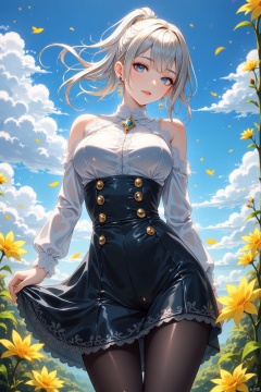 ((Black Pantyhose)),realistic,shiny skin, shiny,super fine illustration,masterpiece, best quality,{beautiful detailed eyes},1girl,finely detail,Depth of field, 4k wallpaper,bluesky,cumulus,wind,insanely detailed frills,extremely detailed lace,BLUE SKY,very long hair,Slightly open mouth,high ponytail,silver hair,small Breasts,cumulonimbus capillatus,slender waist,There are many scattered luminous petals,Hidden in the light yellow flowers,Depth of field,She bowed her head in frustration,Many flying drops of water,Upper body exposed,Many scattered leaves,branch ,angle ,contour deepening,cinematic angle ,{{{Classic decorative border}}}