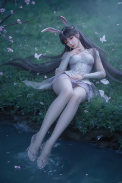 A serene 8K photo of a lonely girl (GG) lying on a lush green field, her long black hair cascading down her back like a waterfall. A delicate hair ornament adorns her hair, an elegant white apron embraces her slim figure, waist, apron, surrounded by petals and branches, makeup, eye shadow, red lips, a small butterfly perches on the edge of the earrings. Added a whimsical atmosphere. Wildflowers, butterflies, petals,1girl, solo, long hair, hair ornament, full body, flower, purple dress, high heels, legs, bare legs, xwhd,Depth of Field, Waterfall, Stream,White pantyhose, crystal shoes,french manicure,nail polish,make up, perspective, delicate face, pink eye shadow,rabbit ears,spread legs,lying on the water,water mist, light, and the Tyndall effect,night,moonlight,reflection,floodlight