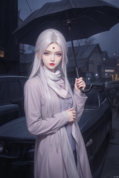 1girl, solo, long hair, looking at viewer, blue eyes, long sleeves, holding, very long hair, white hair, outdoors, scarf, lips, coat, night, umbrella, facial mark, letterboxed, ground vehicle, rain, holding umbrella, forehead mark, white scarf, red lips,hold umbrella