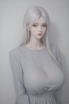 1girl, solo, long hair, breasts, looking at viewer, dress, medium breasts, closed mouth, standing, white hair, lips, grey eyes, makeup, facial mark, red lips, against wall, grey dress