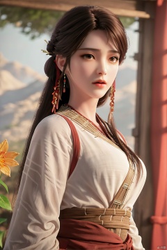 (Clear lines,      high definition,      Best quality,      Very detailed,      masterpiece,      Movie lighting effects,      4K),1girl, solo, long hair, looking at viewer, simple background, brown hair, hair ornament, brown eyes, jewelry, closed mouth, upper body, flower, earrings, hair flower, lips, chinese clothes, realistic, hanfu