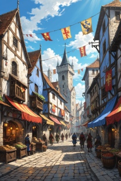 dnd best quality masterpiece atmospheric digital painting artwork 4k 8k highly detailed colorful wealthy (beautiful winding medieval city street:1.2) flags and banners hanging between buildings stone plaster shops taverns people market (bright morning light:1.1) sunny blue sky mat painting, key visual anime background screencap
