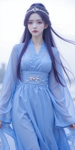 guofeng,1girl, purple hair,A woman is wearing a blue dress. The dress is flowing around her. The woman has long dark hair. There is a headpiece on the woman's head.<lora:天穹长老2.0:0.8>