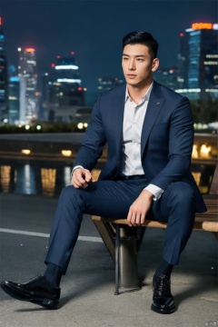 1man,(realistic:1.3),male focus,asian,exquisite facial features,handsome,muscular,suit,shirt,pants,sheer socks,footwear,sitting,full body,dimly lit,city,outdoors,neon lights,Dynamic pose, city landscape, romantic realism, atmospheric, perfect background, magnificent, masterpiece, realistic, best quality, highly detailed,profession, creative, glowing, dynamic,jzns,jmsw