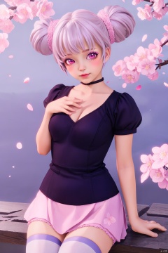pink skirt,Blue sky,Cherry Blossoms,petals,sitting, looking at viewer, 1girl,solo,chibi,loli,short hair,makeup,breasts,thighhighs,twintails,pink eyes,hair bun,(8k, RAW photo, best quality, masterpiece:1.2),(realistic, photorealistic:1.3),ultra-detailed,extremely detailed cg 8k wallpaper,(chibi:1.3),