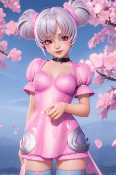 closed mouth,Happiness,wariza,puffy short sleeves,looking at viewer,pink skirt,Blue sky,Cherry Blossoms,petals, looking at viewer, 1girl,solo,chibi,loli,short hair,makeup,breasts,thighhighs,twintails,hair bun,(8k, RAW photo, best quality, masterpiece:1.2),(realistic, photorealistic:1.3),ultra-detailed,extremely detailed cg 8k wallpaper,(chibi:1.3), Thin legs,Gradient Thigh Socks,