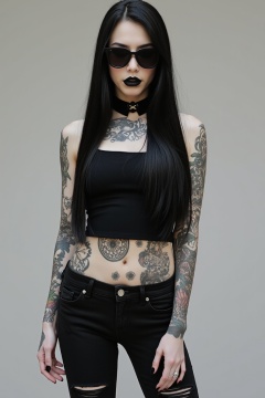 fullbody, Female goth with pale skin, long straight black hair, dressed in black ripped jeans with a black cropped tanktop, sunglasses, black lipstick, tattooed, tattooed face, tattooed body,