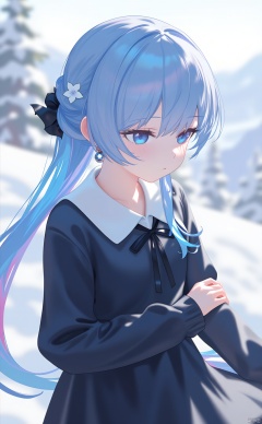 The image is a digital illustration of a young girl with long blue hair. She is wearing a black dress with a white collar and a black bow at the waist. Her hair is styled in loose waves and falls over her shoulders. She has a pair of earrings and a small flower in her hair. The background is blurred, but it appears to be a snowy landscape with trees and mountains in the distance. The girl is looking off to the side with a serious expression on her face. The overall mood of the image is peaceful and serene.