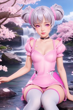 sitting, looking at viewer, waterfall, (cherry blossoms), (milfeulle sakuraba),petals, sky, cloud, day, blue sky, petals, water, stone, loudy sky, 1girl,solo,chibi,loli,short hair,makeup,breasts,thighhighs,twintails,pink eyes,hair bun,Pink and white thigh socks,(chibi:1.1),(Slim Body:1.2),loli,(Thin legs:1.2),nail polish, makeup,(8k, RAW photo, best quality, masterpiece:1.2),(realistic, photorealistic:1.3),ultra-detailed,extremely detailed cg 8k wallpaper,(crystalstexture skin:1.2),extremely delicate and beautiful