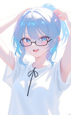 An animated image of a girl with blue hair and glasses. The girl is wearing a white t-shirt with a black tie around her neck. Her eyes are blue and her hair is wavy. Her arms are raised above her head. The background is white.