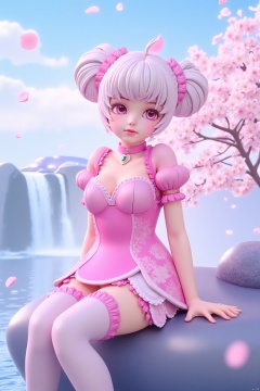 sitting, looking at viewer, waterfall, (cherry blossoms), (milfeulle sakuraba),petals, sky, cloud, day, blue sky, petals, water, stone, loudy sky, 1girl,solo,short hair,makeup,thighhighs,twintails,pink eyes,hair bun,Pink and white thigh socks,nail polish, makeup,(8k, RAW photo, best quality, masterpiece:1.2),(realistic, photorealistic:1.3),ultra-detailed,extremely detailed cg 8k wallpaper,(crystalstexture skin:1.2),extremely delicate and beautiful