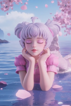 from above,topknot,on stomach, looking at viewer, waterfall, (cherry blossoms), (milfeulle sakuraba),petals, sky, cloud, day, blue sky, petals, water, stone, loudy sky, 1girl,solo,short hair,makeup,thighhighs,twintails,hair bun,Pink and white thigh socks,nail polish, makeup,(8k, RAW photo, best quality, masterpiece:1.2),(realistic, photorealistic:1.3),ultra-detailed,extremely detailed cg 8k wallpaper,(crystalstexture skin:1.2),extremely delicate and beautiful