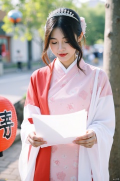a young Asian woman dressed in a kimono-style dress, adorned with a white and red shawl, is holding a white paper in her hands. Her hair is pulled back in a ponytail, and she is wearing a tiara on her head. She is looking down at the paper, and her eyes are closed. The background is blurred, with a tree, a street lamp, and a building visible in the distance. To the left of the woman, a red lantern is visible.