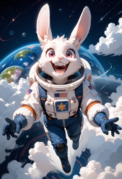 score_9,score_8_up,score_7_up,masterpiece,best quality,8k,Cute fluffy rabbit wearing space suit standing on planet base Above,from above,evil_smile,teeth,open_mouth,floating in the air,clouds,fog,