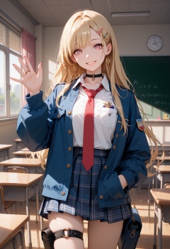 score_9,score_8_up,score_7_up,masterpiece,best quality,8k,1girl,solo,pink eyes,blonde hair,long hair,hairclip,hoop earrings,black choker,white shirt,red necktie,loose necktie,breast pocket,blue jacket,plaid skirt,standing,looking at viewer,pink nails,parted lips,thigh strap,thigh pouch,standing,indoors,classroom,smile,waving,