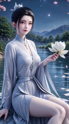 SFW,(masterpiece:1.2),best quality,absurdres,masterpiece,original,extremely detailed wallpaper,perfect lighting,(extremely detailed CG:1.2),1girl,solo,black hair,hair ornament,dress,holding,jewelry,sitting,flower,sky,hair bun,night,facial mark,chinese clothes,single hair bun,forehead mark,outdoors,sky,water,necklace,tree,petals,bare legs,night,facial mark,cherry blossoms,mountain,forehead mark,branch