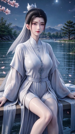 SFW,(masterpiece:1.2),best quality,absurdres,masterpiece,original,extremely detailed wallpaper,perfect lighting,(extremely detailed CG:1.2),1girl,solo,black hair,hair ornament,dress,holding,jewelry,sitting,flower,sky,hair bun,night,facial mark,chinese clothes,single hair bun,forehead mark,outdoors,sky,water,necklace,tree,petals,bare legs,night,facial mark,cherry blossoms,mountain,forehead mark,branch