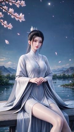 SFW,(masterpiece:1.2),best quality,absurdres,masterpiece,original,extremely detailed wallpaper,perfect lighting,(extremely detailed CG:1.2),1girl,solo,black hair,hair ornament,dress,holding,jewelry,sitting,flower,sky,hair bun,night,facial mark,chinese clothes,single hair bun,forehead mark,outdoors,sky,water,necklace,tree,petals,bare legs,night,facial mark,cherry blossoms,mountain,forehead mark,branch