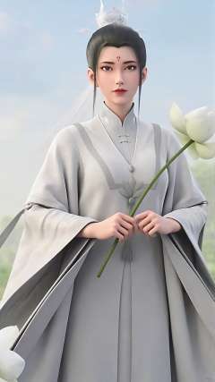 flower, 1girl, solo, forehead mark, holding flower, black hair, facial mark, holding, blurry background, chinese clothes, hanfu, wide sleeves, outdoors, hair bun, blurry, long sleeves, hair ornament, standing, photo background, realistic, lotus, looking at viewer, black eyes, white flower, day