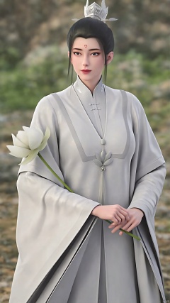 flower, 1girl, solo, forehead mark, holding flower, black hair, facial mark, holding, blurry background, chinese clothes, hanfu, wide sleeves, outdoors, hair bun, blurry, long sleeves, hair ornament, standing, photo background, realistic, lotus, looking at viewer, black eyes, white flower, day