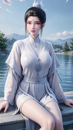 1girl, forehead mark, facial mark, hair bun, water, solo, bare legs, dress, black hair, white dress, single hair bun, hair ornament, looking at viewer, outdoors, sky, jewelry, wet, earrings, chinese clothes, sitting