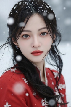 snow.,luoxue,cinematic photo ,Best quality , (masterpiece:1.2) , cinematic photo,1woman,A beautiful girl in red hanfu, Standing in the wind andsnow, long hair blown by the wind,snow in the sky , upperbody,snowing,snowy day,in winter ,motion blur ,(sad:1.1),(crying:1.1),close-up,(tears:1.1),(face focus:1.1),(close mouth:1.1),front view ,35mm photograph, film, bokeh, professional, 4k, highly detailed,helgirls