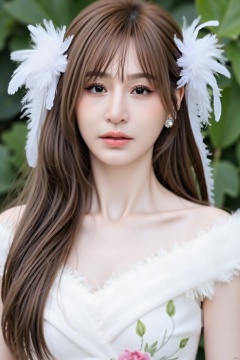 luoxue,snow,a young Asian girl with long brown hair,She is dressed in a white dress adorned with white feathers, her hair cascades over her shoulders. Her dress is adorned with a floral pattern, adding a touch of color to the scene.