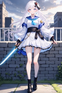 An animated image of a girl with long white hair and blue eyes. She is wearing a white and blue dress with a black belt around her waist. She has black boots on her feet and black gloves on her hands. Her hair is blowing in the wind and she is holding a sword in her right hand. The sword is a bright blue color. Behind her is a gray brick wall with green grass growing on it. Behind the wall is a white fence and behind the fence are buildings. The sky is filled with dark gray clouds.