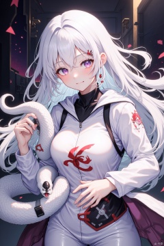 A female character with long white hair and a fierce expression on her face. She is wearing a futuristic outfit with a white and red color scheme. The outfit has a high neckline and long sleeves, and she is holding a large white snake in her hands. The snake is coiled around her body, with its head turned to the side and its mouth open, as if it is roaring. The background is dark and ominous, with a hint of purple and pink. The overall mood of the image is fierce and powerful.