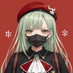 muzumi,1girl, solo, long hair, looking at viewer, bangs, shirt, hat, brown eyes, jewelry, upper body, earrings, green hair, virtual youtuber, black shirt, ascot, mask, beret, red headwear, red background