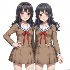 1girl, solo, long hair, looking at viewer, blush, smile, bangs, simple background, black hair, long sleeves, white background, dress, ribbon, brown eyes, school uniform, standing, serafuku, sailor collar, red ribbon, neck ribbon, buttons, sailor dress, arms at sides, double-breasted, brown dress, pleated dress, hanasakigawa school uniform,yuri,red eyes