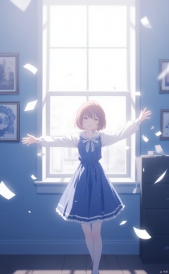 An animated image of a girl in a blue and white dress. The girl is standing in front of a window with her arms outstretched. She is wearing a white bow tie around her neck. Her hair is short and brown. There are white papers flying in the air around the girl. There is a blue wall behind the girl and a black box on the floor to the right of the window. Two framed pictures are on the wall to the left of the image.