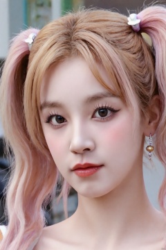 A sultry close-up shot of the cosplayer, Pigtails, featuring her vibrant pink locks adorned with loose strands and a streaked design. Her symbol-shaped pupils sparkle like emeralds, drawing attention to her striking green eyes. A delicate hair bell dangles from her tresses, adding a touch of whimsy. Short, defined eyebrows frame her face, while statement earrings accentuate her ears. The soft focus and shallow depth of field create a dreamy atmosphere, inviting the viewer to revel in her sultry gaze.