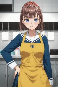 1girl, solo, looking at viewer, smile, short hair, blue eyes, brown hair, hair ornament, school uniform, ponytail, serafuku, apron, hand on hip, scrunchie, hair scrunchie,rii