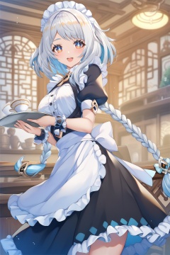 score_9,score_8_up,score_7_up,score_6_up,score_5_up,score_4_up,source_anime,source_cartoon,<lora:mualaniTUPONYXL-000001:0.7>,mualani \(genshin impact\),1girl,solo,apron,white hair,maid,breasts,cup,looking at viewer,smile,indoors,short sleeves,wrist cuffs,long hair,frills,maid headdress,dress,puffy sleeves,twin braids,multicolored hair,holding,white hair,puffy short sleeves,open mouth,skirt hold,maid apron,teacup,flower,tray,blurry background,white apron,black dress,blurry,